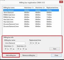 The lifespan of the cutting burs are all dependent on type of cutting bur (diamond or gold) and brand of material that you are using. The best way to calculate bur life is by setting the tool at the maximum hours, and then recording the hours when there is noticeable defects to the surface quality. For Example, if I am milling zirconia and I notice that my margins are chipping at a bur life of 91 hours and 32 minutes, I would then set my bur lifespan at 90 hours. After all of the burs are registered for the materials that are being milled, go ahead and close out of bur registration.