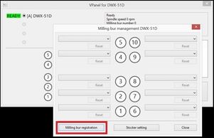 The bur management application is located on the VPanel and is highlighted in red below. The Roland DWX-51D has a total of 10 bur slots available allowing the user to seamlessly switch between materials without swapping burs. With the milling bur management application open, we need to register the burs that you are using. Please select "Milling bur registration" on the bottom of the bur management application.